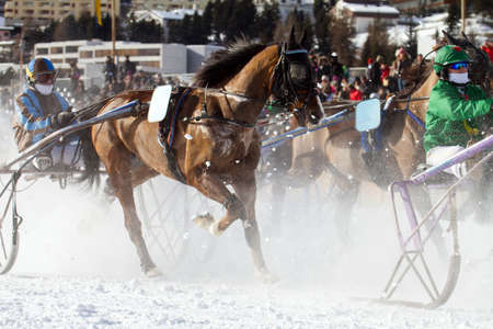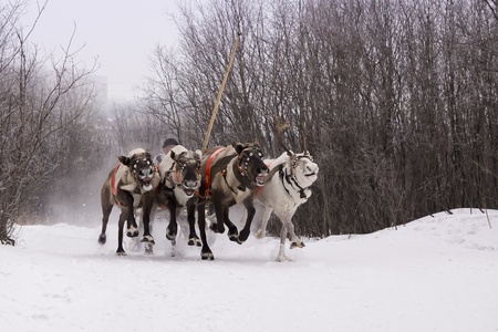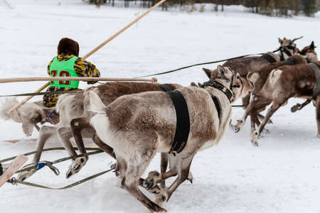 Reindeer herders racing on holiday. Shepherds competing in the speed of their reindeer teams. Deer quickly running in the snow.