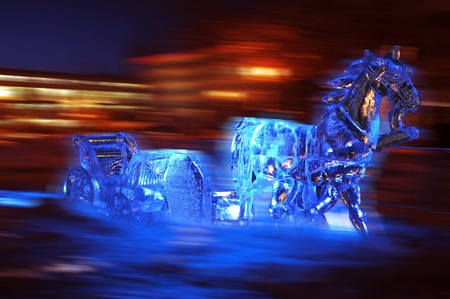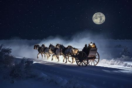 sleigh being pulled by horses, with a glimpse of the full moon visible in the night sky, created with generative ai