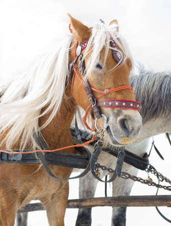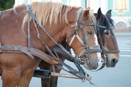 Two beautiful brown horses in the streets of Lviv, Ukraine. Tourist carriage waiting for passengers on the streets in historic city center.