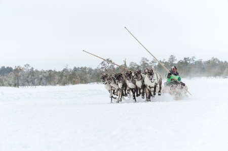 Russkinskaya, Surgut, Russia, 03/23/2019: open traditional holiday of reindeer herders and fishermen, indigenous peoples of Siberia. Serious competition of reindeer sleds begins at the start.