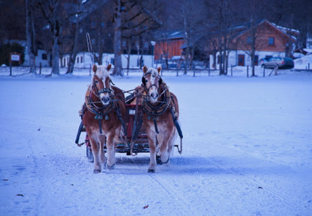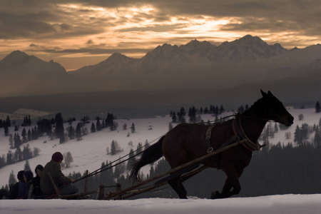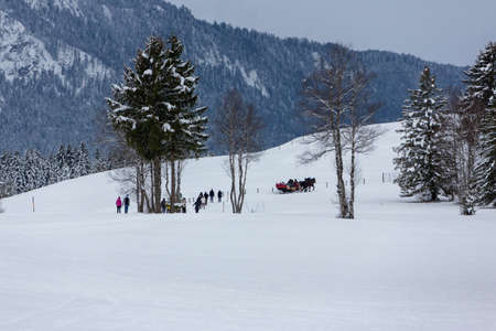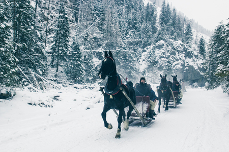 ZAKOPANE, POLAND, February 10, 2018, Several harnesses of a sleigh drawn by horses are riding along a snow-covered road in the mountains, people are sitting on a sleigh