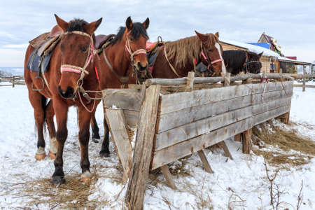 Deers harnessed to the sledges on a sunny winter day. Arkhangelsk region, Russia