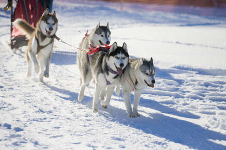 Husky sled dog racing. Winter sport competition. Siberian husky dog mushing.