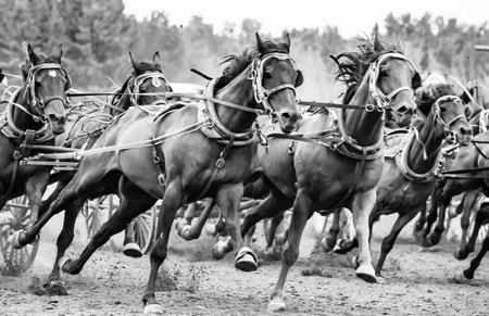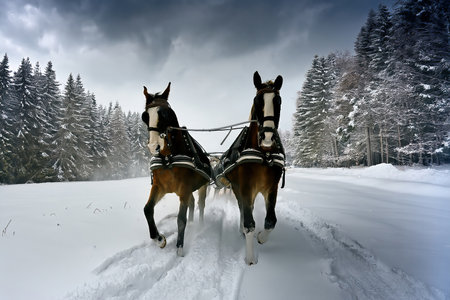 A group of horses navigates through a snow-covered landscape, embodying strength and resilience. the focus on the foreground equine highlights detail in their snowy coat, while the blurred background adds depth and movement to the wintry scene. Generative AI