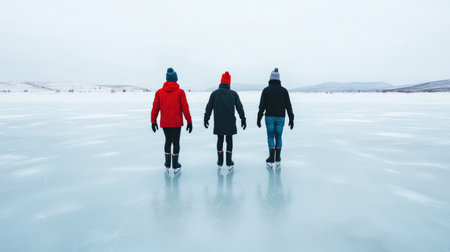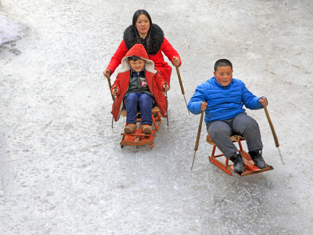 LUAN COUNTY - JANUARY 10: Woman and children were skating on the ice on January 10, 2015, Hebei Province, Luan County, China