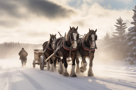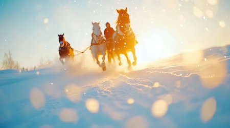 Man running two beautiful horses in winter. Fast transport and cold weather. Generative AI