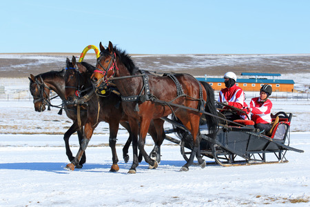 BELOKURIKHA, RUSSIA - MARCH 12, 2016: The Russian three of horses during the holiday Farewell to winter