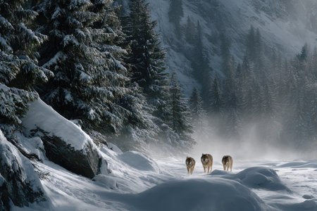 Three wolves travel through a snowy forest, surrounded by tall evergreen trees. The mist adds a mysterious touch to this tranquil winter scene.