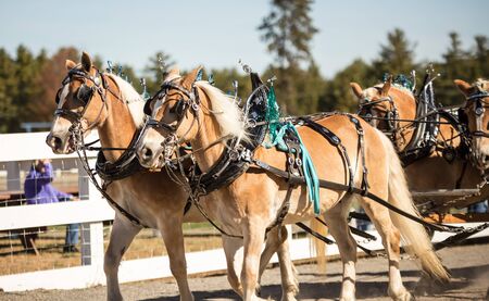 Traditional Russian troika of horses. Three horses pulling a sleigh in winter in the snowfall