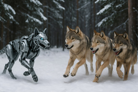 Robotic wolf racing through a snowy forest, encountering three real wolves sprinting towards it in a tense and thrilling moment
