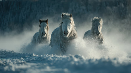 Three majestic white horses gallop through a snowy landscape, kicking up powdery snow against a serene winter backdrop. Their powerful movement evokes a sense of freedom and grace.