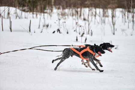 Running Pointer dog on sled dog racing. Winter dog sport sled team competition. English pointer dog in harness pull skier or sled with musher. Active running on snowy cross country track road