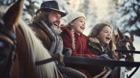 Riding through a snowy landscape, the family enjoys a horse drawn sleigh, their breath visible in the frosty air as sunlight sparkles on the snow.