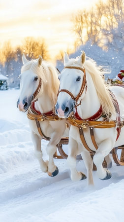 Two beautiful white horses with flowing manes enthusiastically pull a sleigh through deep snow during sunset.