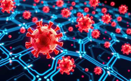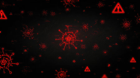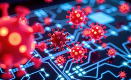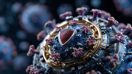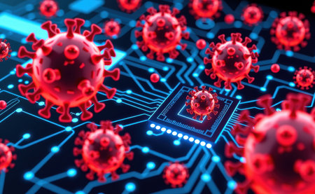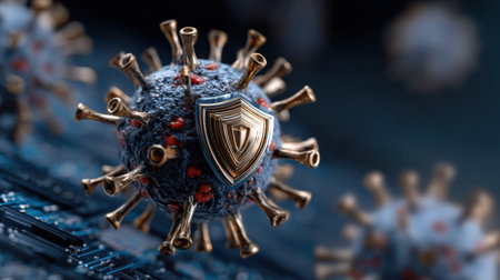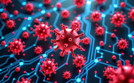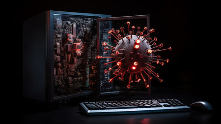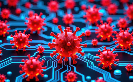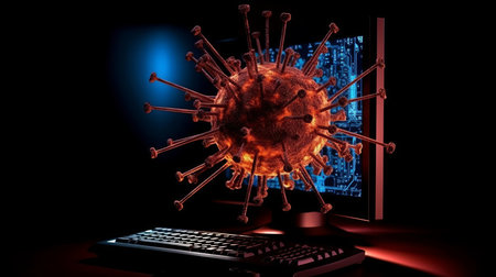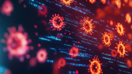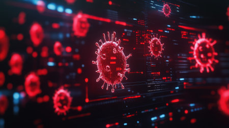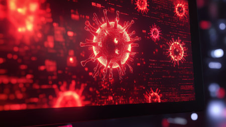A striking representation of a virus, with red spikes, floating in a digital environment filled with glowing code. This artwork symbolizes the threat of cyber attacks and malware.