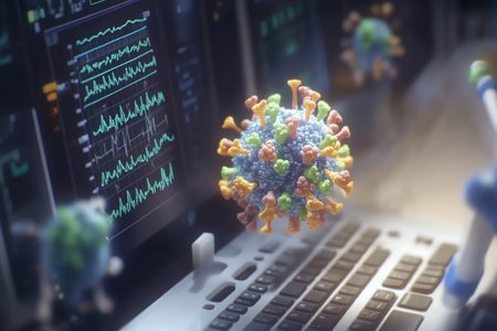 Virus model rests on a keyboard, symbolizing the intersection of health and technology, highlighting challenges faced during health crises in communication