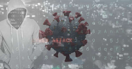 Composition of hooded hacker with cell and cyber attack security warning on screen. global pandemic and cyber security concept digitally generated image.
