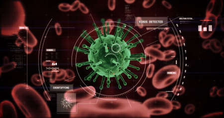 Floating central virus particle exhibiting red spikes in data panel with code lists and blue lines. Biotech, digital, futuristic, microbiology, biomedical, cybersecurity, analytics