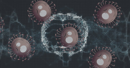 Image of covid 19 cells and emojis with human brain spinning. global covid 19 pandemic concept digitally generated image.