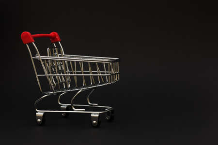 small metal trolley from the supermarket on a black background. Horizontal photo, low key photo, Copy space. Concept - sales, advertising Black Friday