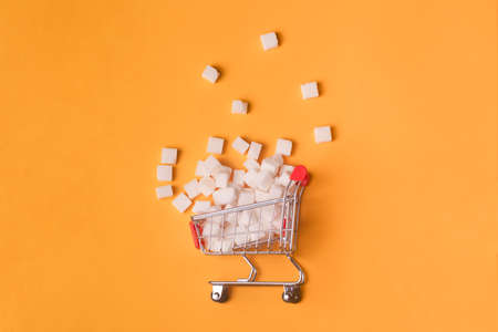 Turned pushcart with pile of white sugar cubes on orange background, sugar rejection concept