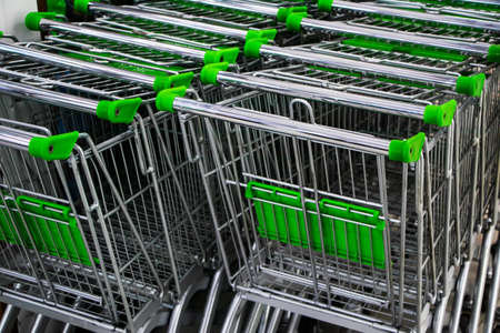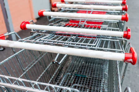 Rows of shopping carts near entrance of supermarket. World consumption problem.