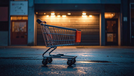 Metal shopping cart standing alone in front of a shuttered store with lights off, symbolizing recession, economic slowdown or reduced consumer activity