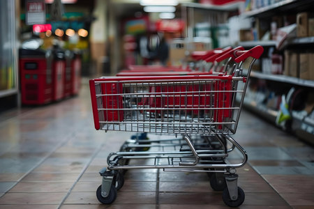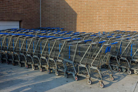 row of empty shopping carts in the big supermarket in California, USA