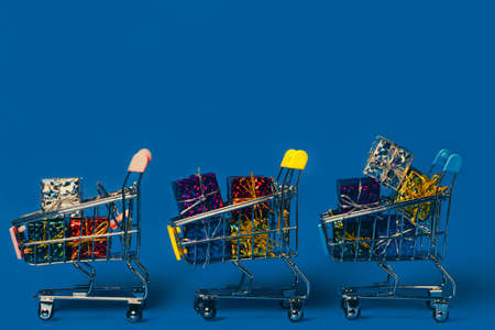 Small decorative trolleys with present boxes on bright colorful background. Christmas or birthday gift. Sales and shopping concept.
