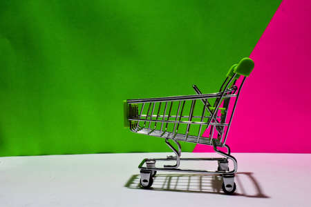 Empty green shopping cart isolated on green and pink background. E-commerce and business marketing concept