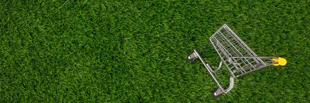 Shopaholic. Buyer. Shopping concept. Close-up. From above. Isolated shopping trolley on a background of green grass. Copy space.