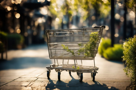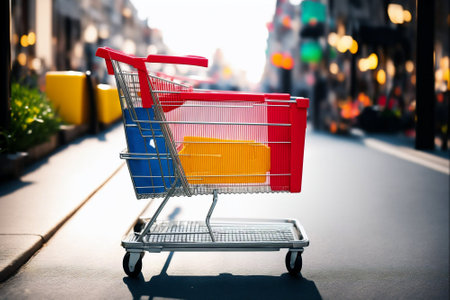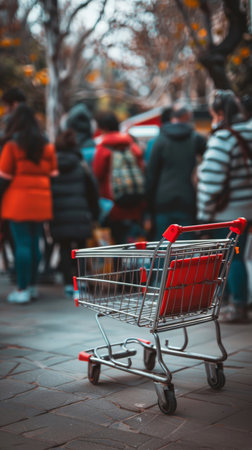 Shopping cart outdoors with a blurred crowd. Represents consumerism and shopping trends. Ideal for discussions on public consumer behavior.