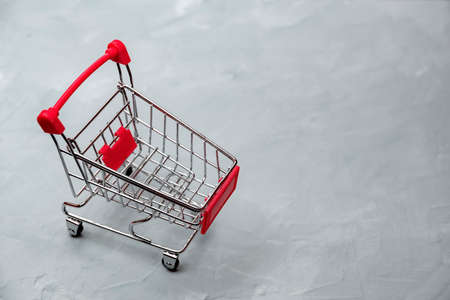 close-up of shopping trolley on gray concrete background with some copy space. Soft focus.