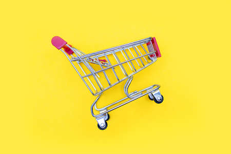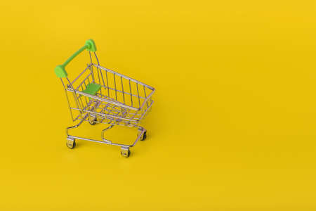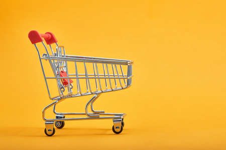 supermarket trolley on yellow background, empty, Concept of shopping. Copy space for advertisement