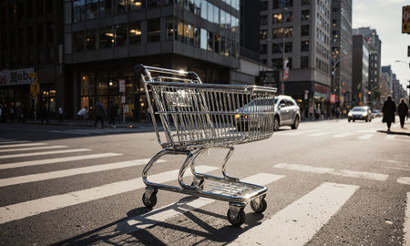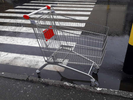 Shopping cart street traffic, abandoned metal trolley standing on city crosswalk asphalt, urban commerce concept copy space.
