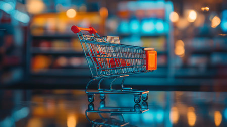 Empty shopping cart in abandoned supermarket, symbolizing declining retail industry generated by artificial intelligence