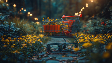 A red shopping cart in an outdoor setting surrounded by plants, lit by string lights in the evening twilight, creating a whimsical atmosphere.