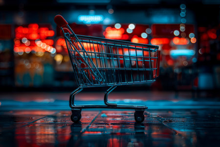 An artistic shot of an empty shopping cart on a wet reflective floor, surrounded by glowing lights in a modern supermarket.