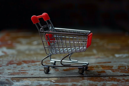 Shopping Cart. Mini shopping trolley on dark wooden background. Mini Shopping Cart On The Table. Business, e-commerce concept