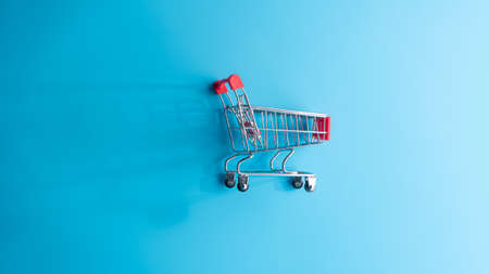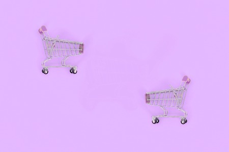 Shopping addiction, shopping lover or shopaholic concept. Small empty shopping cart lies on a pastel colored paper background. Flat lay minimal composition, top view.