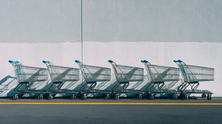 A row of shopping carts are lined up against a wall. Row of Shopping Carts Against Wall