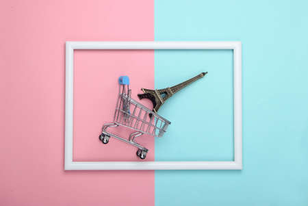 Travel concept. Shopping trolley with figurine of eiffel tower in a white frame on a blue-pink pastel background