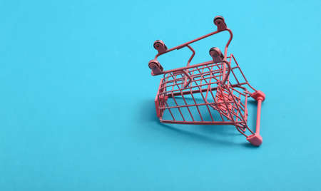 Mini pink supermarket trolley on blue background. shopping concept