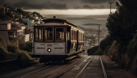 Old cable car travels through city skyline generated by artificial intelligence