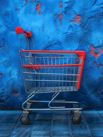 Shopping cart against a textured blue wall background.