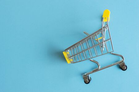 The Yellow Shopping Cart on a isolated blue background. Minimal flat lay with copyspace for your text or message.
