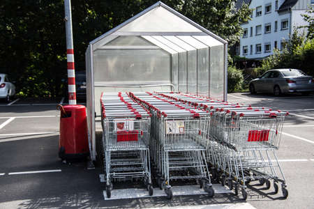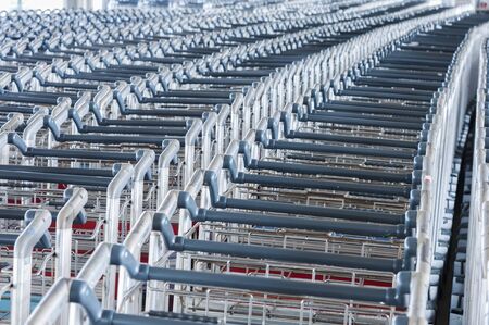 Many empty shopping carts on the shop parking. Row of shopping trolleys for supermarket buyers