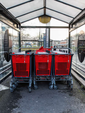 Shopping trolleys outside the supermarket Auchan
