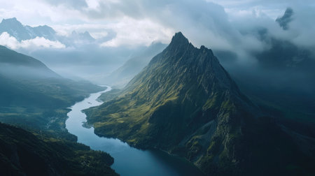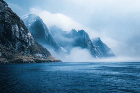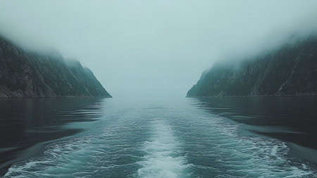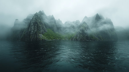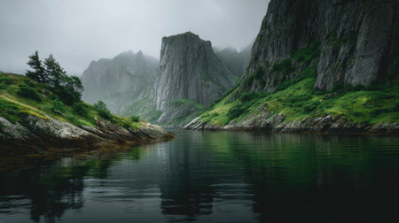 This captivating landscape showcases misty mountains towering over calm waters, evoking tranquility and a sense of adventure in Norway's unspoiled nature.