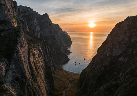 Aerial view of Norwegian fjord landscape with deep blue-green water, surrounded by towering mountains. Sky above features orange, pink hues, sunrise sunset. Ideal for travel agency, tour promotions.